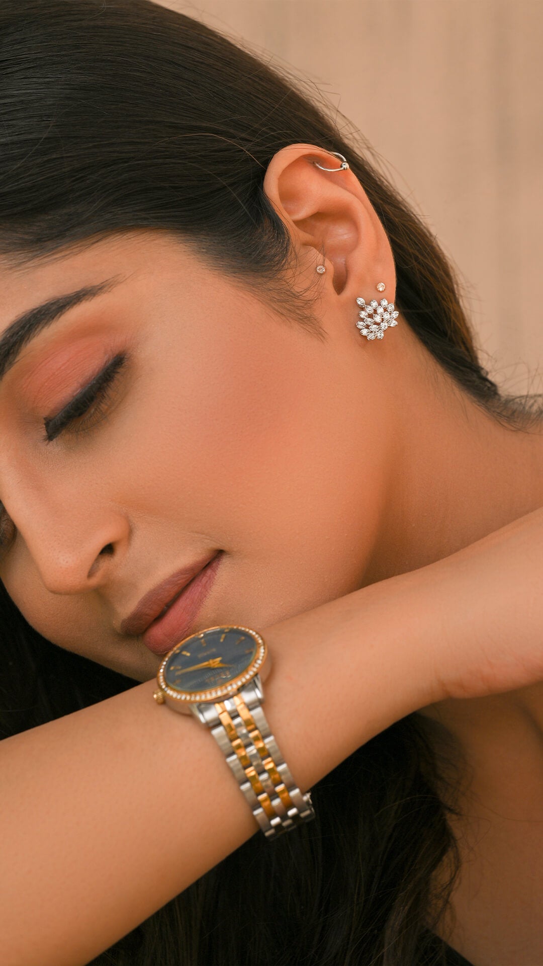 Crown-shaped silver tops, gold-plated and adorned with shimmering zircons for an elegant touch. Crafted from pure silver and meticulously manufactured in Pakistan, these tops offer a regal yet modern look, perfect for those who seek timeless elegance. Ideal for both everyday wear and special occasions