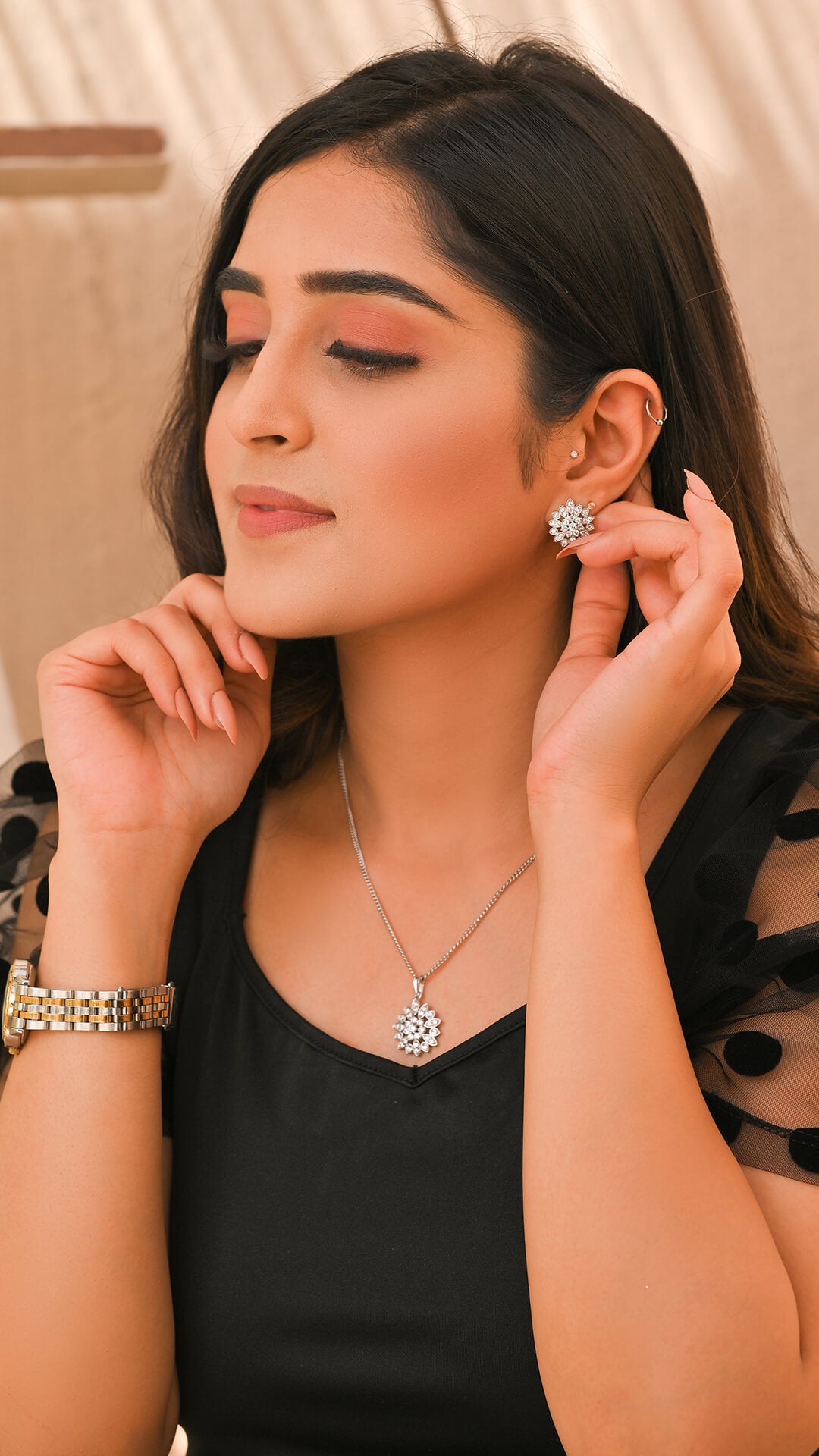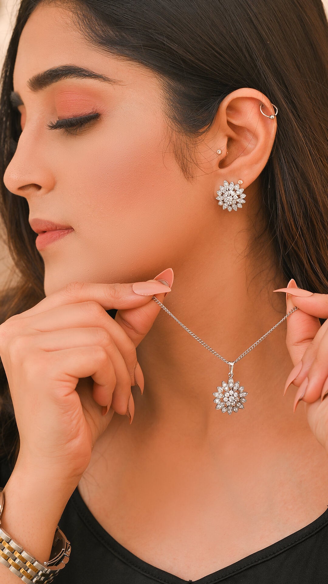 Part of our Dilara Collection, a symbol of delicate beauty and timeless elegance. This exquisite set features a locket adorned with a captivating dahlia design, enhanced with a sleek silver polish and embellished with sparkling zircons. Meticulously crafted, this set is designed to be a cherished keepsake, reflecting both sophistication and sentimentality.