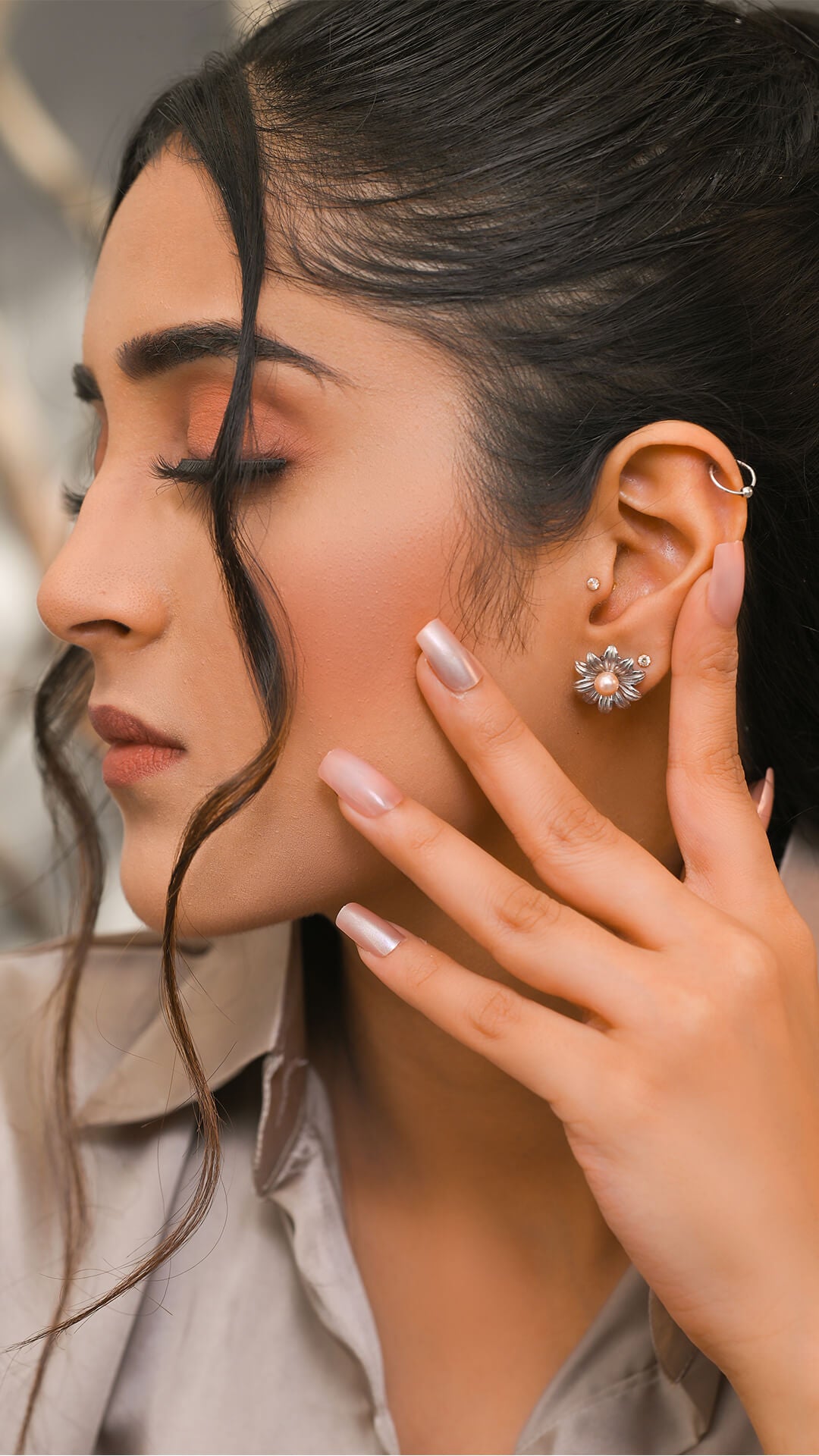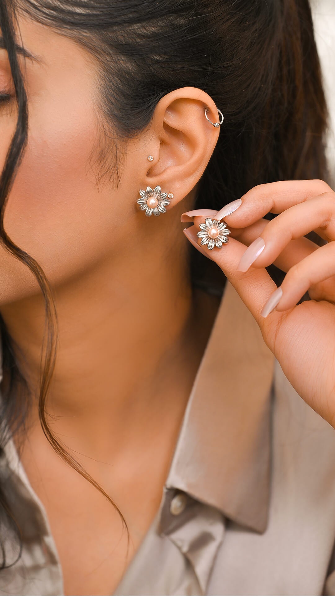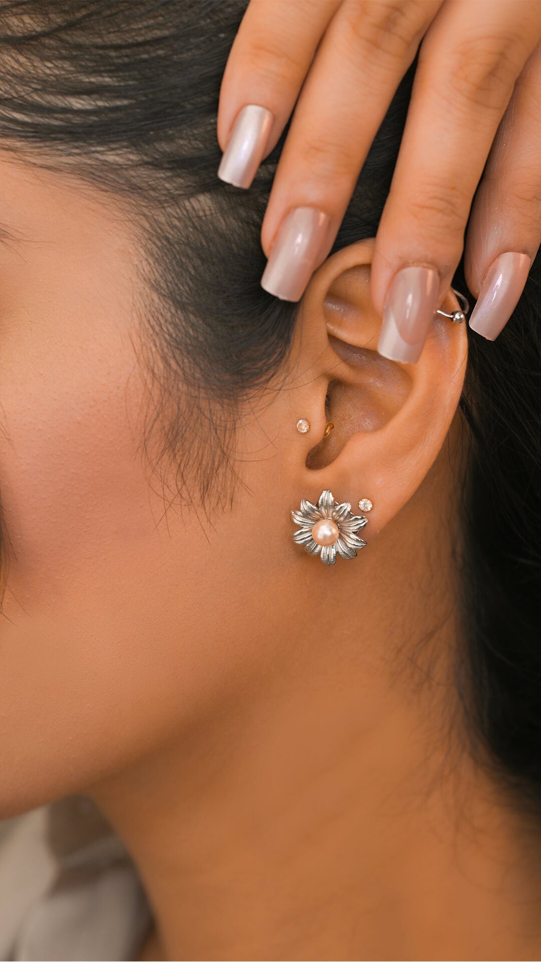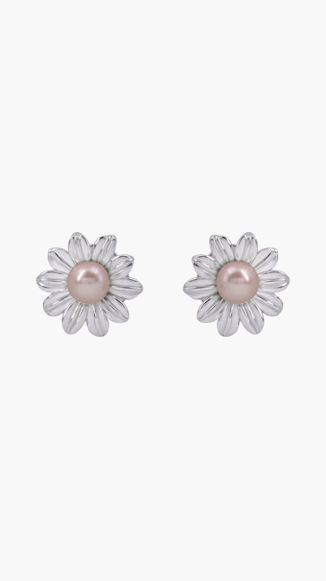 Flower-shaped tops, crafted in pure silver and adorned with a lustrous pink pearl at the center. These delicate earrings combine timeless elegance with a touch of natural beauty.